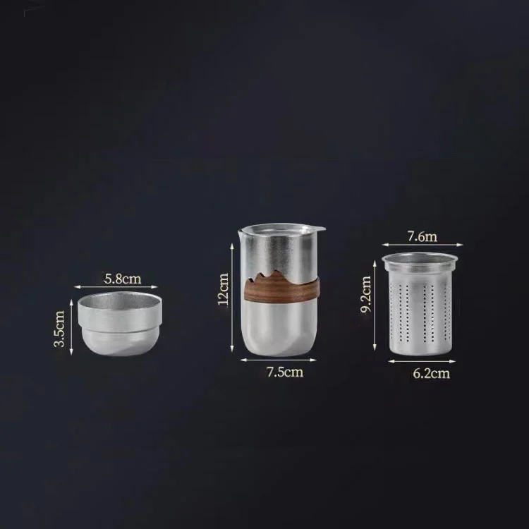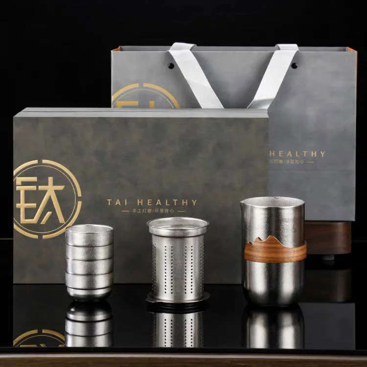 Это чайный набор для открытия, он изготовлен из титана и упаковки с коробкой подарков. Четыре маленьких титановых чашки, одна большая чашка титаниунма и один кожаный корпус. Четыре маленьких чашки могут быть легко помещены в большую чашку, а затем большую чашку можно положить в сумку. Один карман достаточно, чтобы удерживать все инструменты. Позвольте вам наслаждаться сильным алкоголем на свежем воздухе с друзьями.